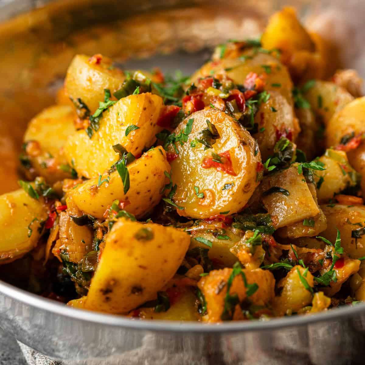 Tender Calabrian potatoes have an Italian Calabrian chili pepper paste that's slightly fruity, tangy and smokey tossed with herbs and butter.