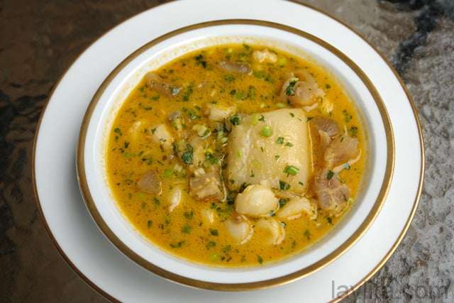 Caldo de pata de res or cow feet soup is a traditional Latin American comfort soup made with cow feet, yuca, mote or hominy, cilantro, parsley, onions, garlic, achiote, cumin, peanuts, milk, oregano.