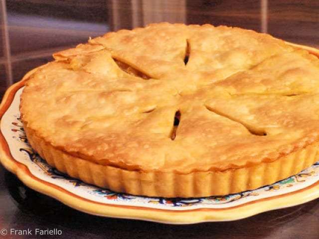 - Spread the sautéed onion mixture in a 23 cm/9-inch pie or quiche pan lined with a crust of your choice (see Notes for details on different crusts to use). Arrange some black olives and anchovy fillets, roughly chopped if you like, evenly on top of the onions. You should use enough so that every bite will have a bit of olive and a bit of anchovy. Cover the pie with another round of crust, pinch the bottom and top crusts together and then either trim off the edges (as in the photo above) or fold the extra bit of crust inwards to make a nice border. Make slits in the top crust to allow air to escape. (If you prefer, you can also simply prick some holes in the crust.)