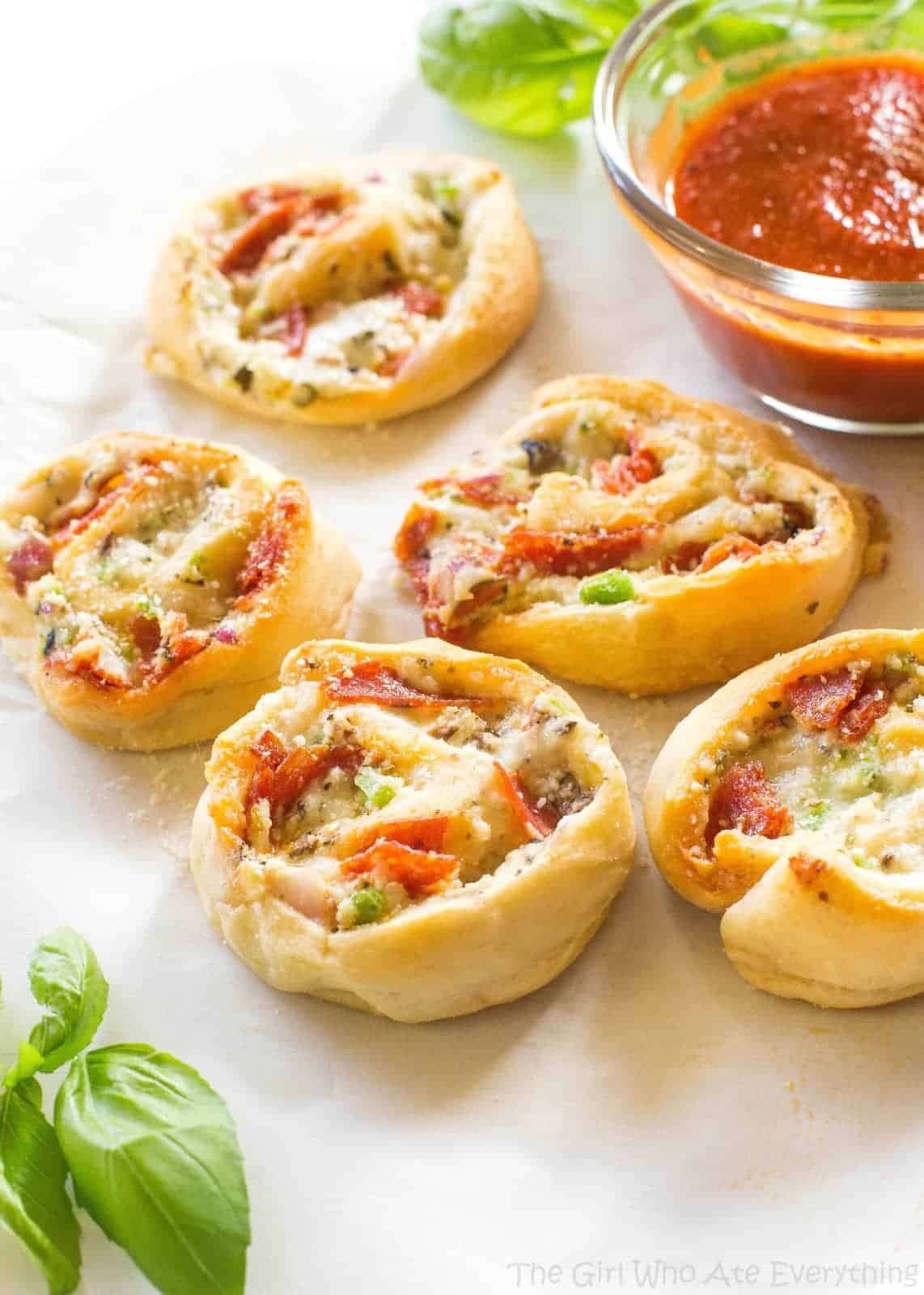 These Calzone Pinwheels are filled with pepperoni, mushrooms, onion, and green bell pepper.