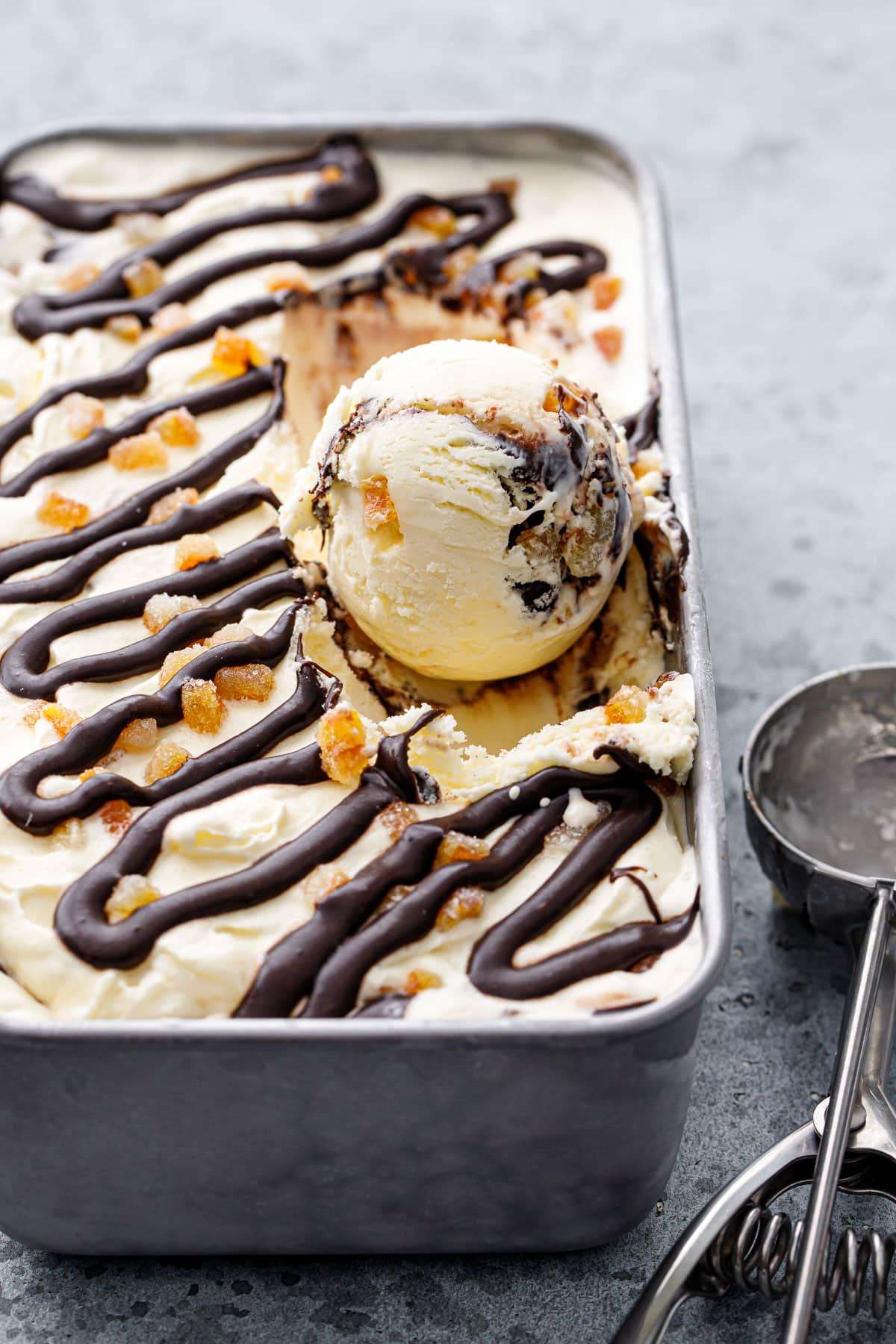 Candied Orange Ice Cream with Chocolate Fudge Swirl