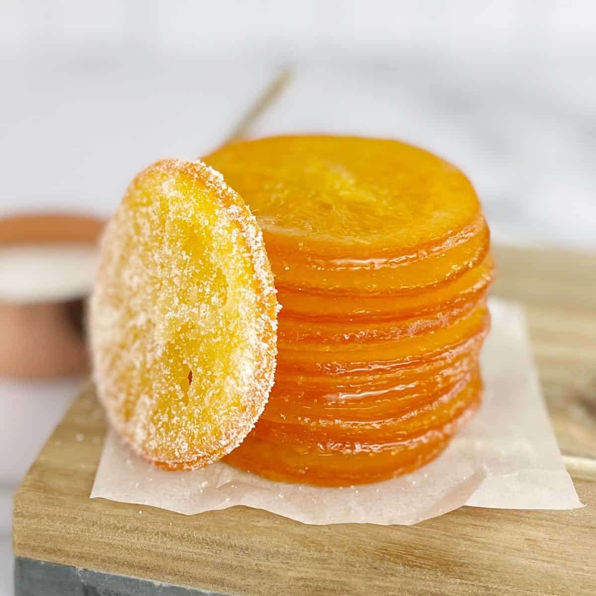 Candied orange slices are easy to make at home. Use them as sweet decorations for desserts or a lovely, chewy citrus treat just on their own!
