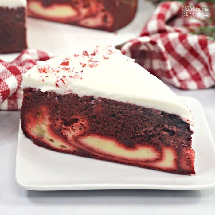 Candy Cane Cheesecake Cake is a fun holiday dessert recipe with a layer of moist Red Velvet cake, a layer of cheesecake and topped with a homemade cream cheese frosting.