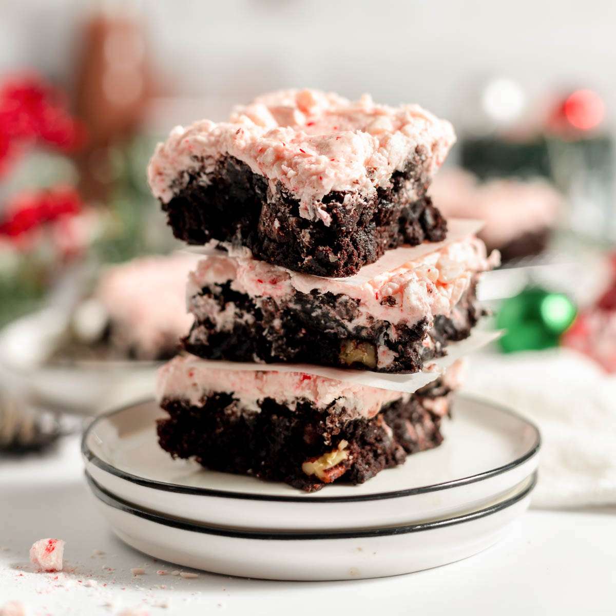 - Frost the cooled brownies with the peppermint frosting and sprinkle with some additional crushed candy cane pieces on top. Cut into squares and serve.