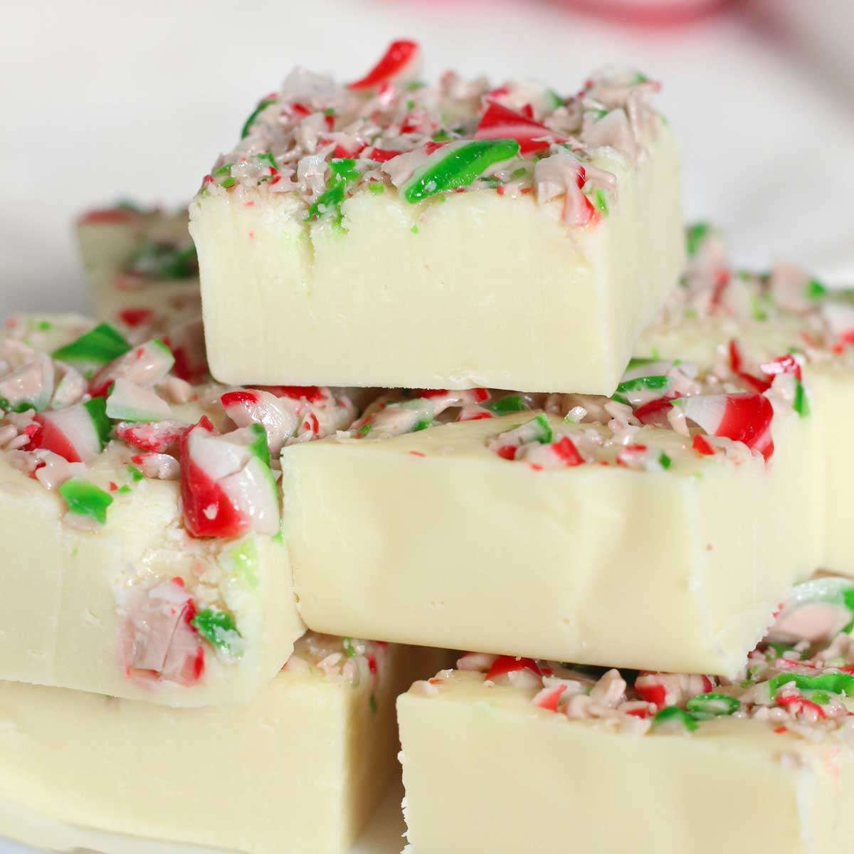 A festive white chocolate peppermint fudge topped with crushed candy canes.