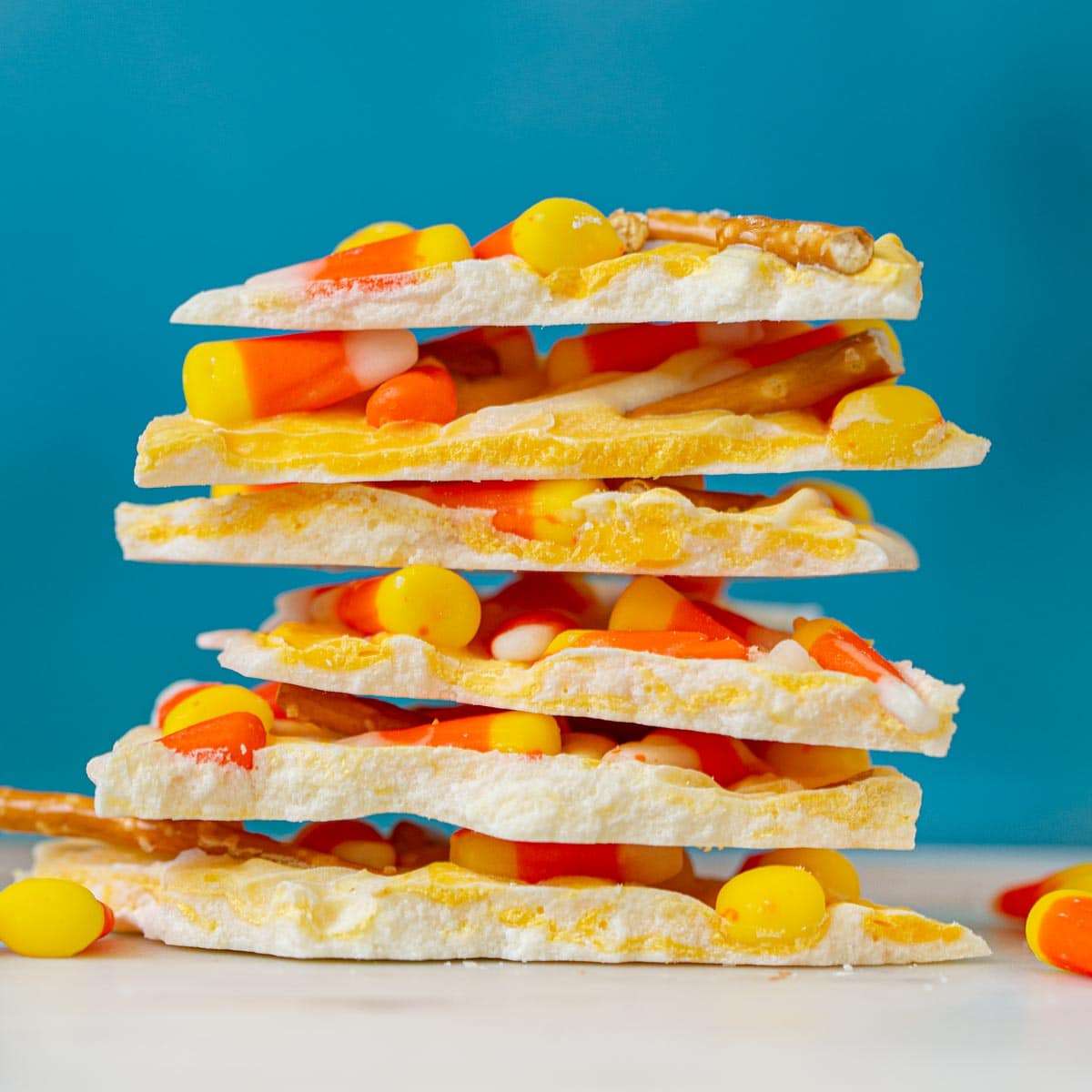 Candy Corn Bark is the perfect homemade Halloween candy treat. Made with a white chocolate base, crunchy pretzel sticks, and candy corn topping.