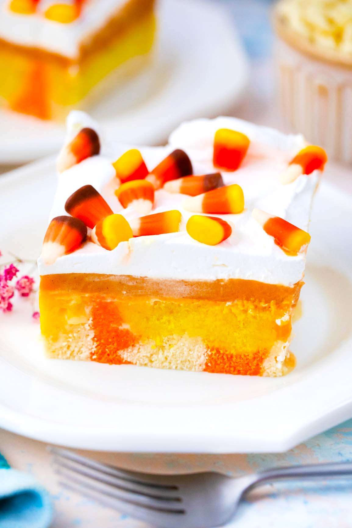 Candy corn poke cake is easy to make and festive. It is soaked in white chocolate sauce and topped with vanilla and pumpkin spice pudding.