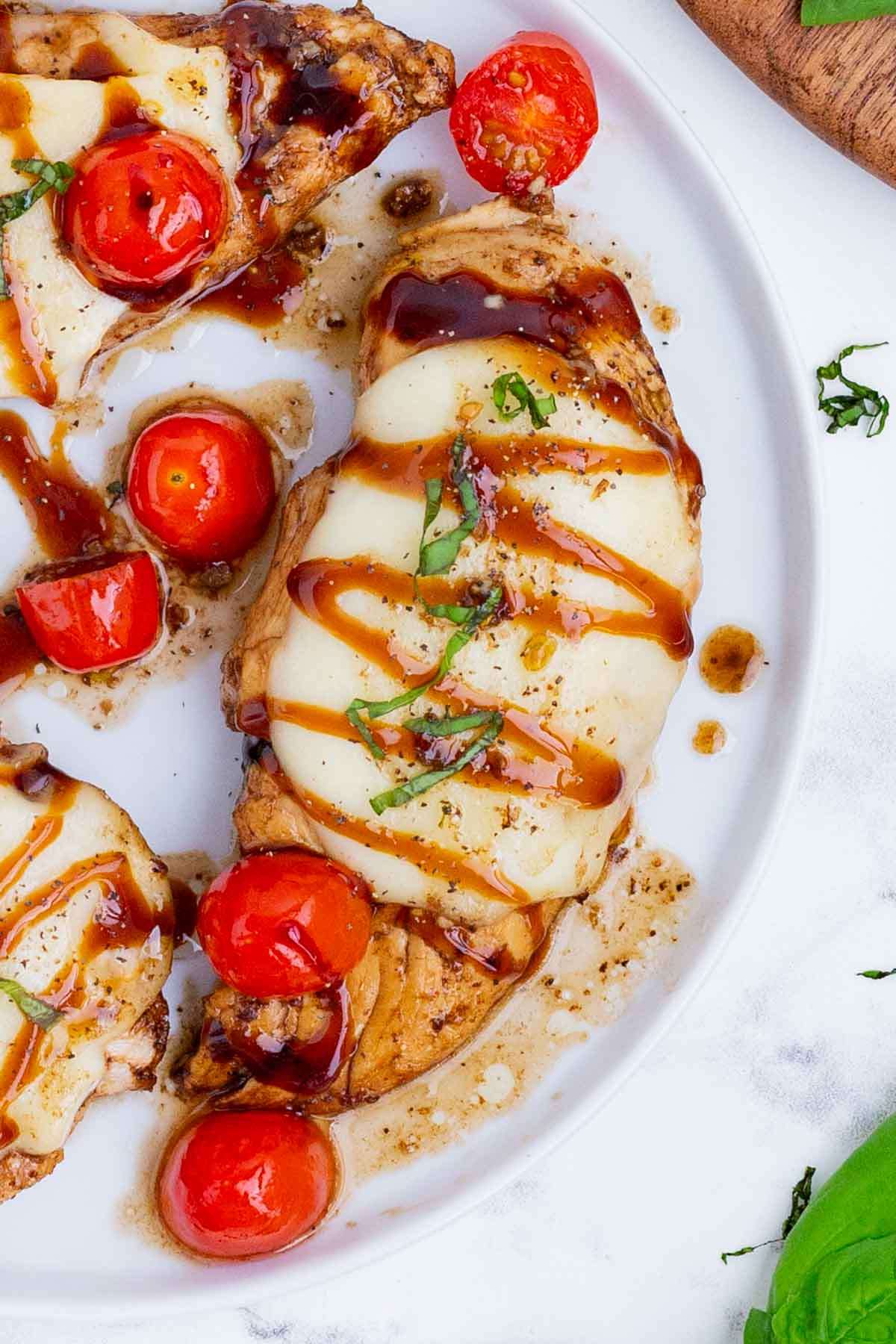Caprese Chicken is loaded with all the classic Italian flavors and ready in under 30 minutes! Seasoned chicken breasts are seared in balsamic vinegar reduction, then topped with mozzarella and tomatoes and baked in the oven for a one-dish meal.