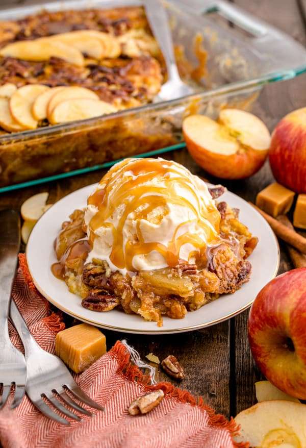 If you're looking for the EASIEST fall dessert, this caramel apple dump cake is just the recipe. It's made with apple pie filling, caramel, yellow cake mix, and toasted nuts, all baked in one dish.