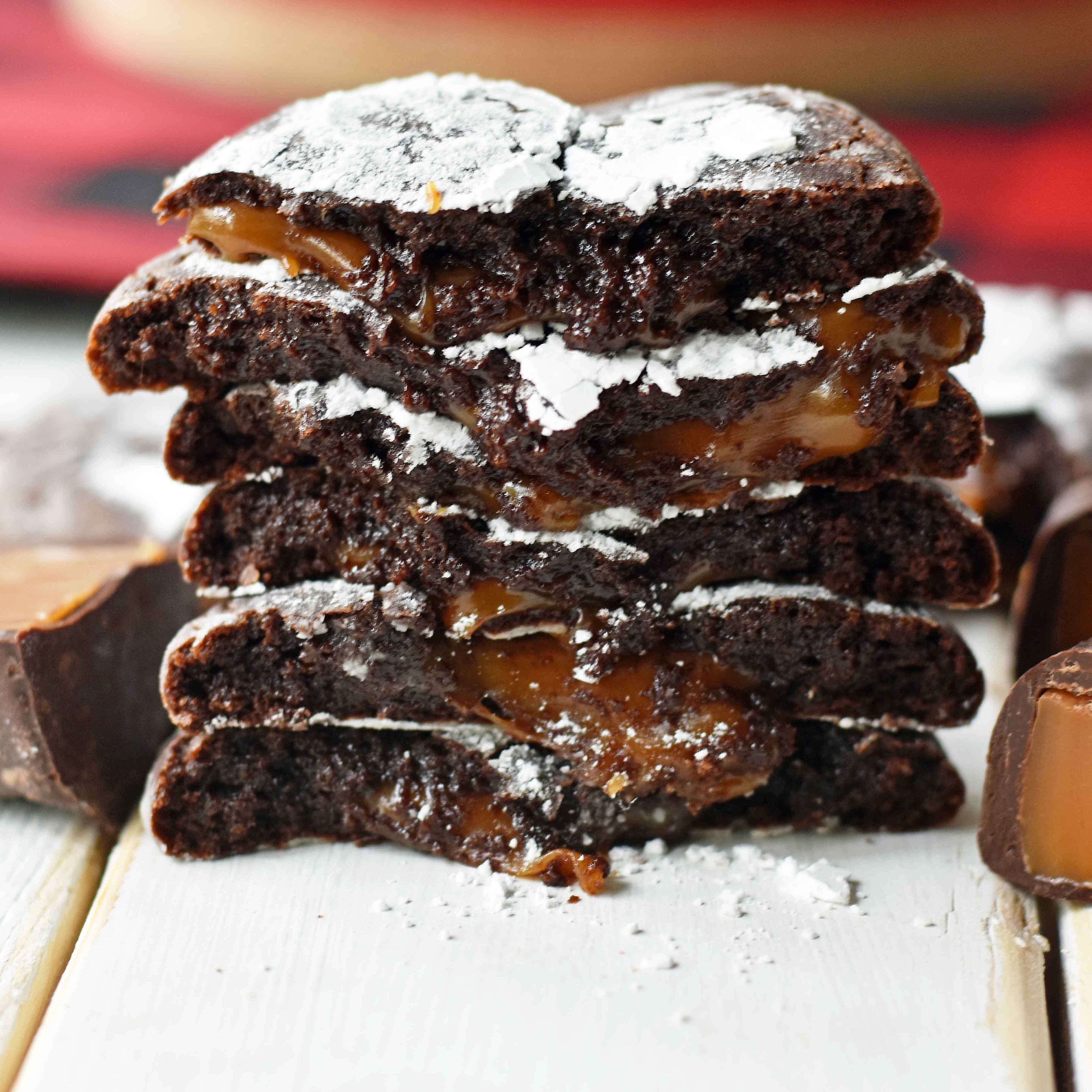 Soft chewy chocolate crinkle cookies filled with an ooey-gooey caramel center.