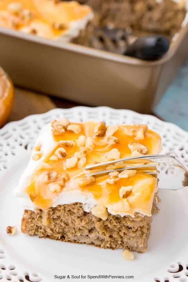 Caramel Spice Poke Cake is a sinfully sweet and seasonal dessert you'll want to make again and again. A moist spice cake topped with whipped cream, caramel, and nuts - it's crazy-good and perfect for the holidays, potlucks, and Sunday supper.