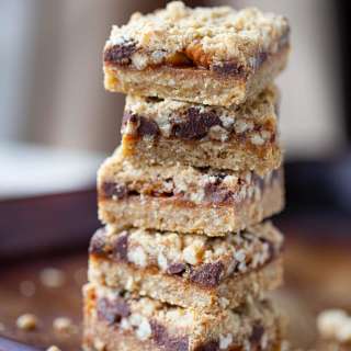 - Pour caramel over the chocolate chips. Carefully place spoonfuls of the remaining oatmeal crust over the caramel, trying to cover most of the caramel. Bake for 13-17 minutes.