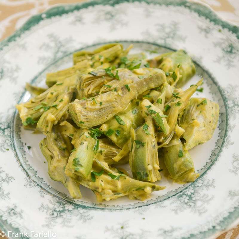 - Remove the skillet from the heat, then add the mixture to the skillet, mixing everything together so the artichokes are well covered. (Depending on how much residual heat is left in the pan, you may need to return the skillet to the burner over the gentlest heat possible.) Toss the artichoke wedges until the mixture has thickened into a creamy sauce. Take care not to scramble the egg.