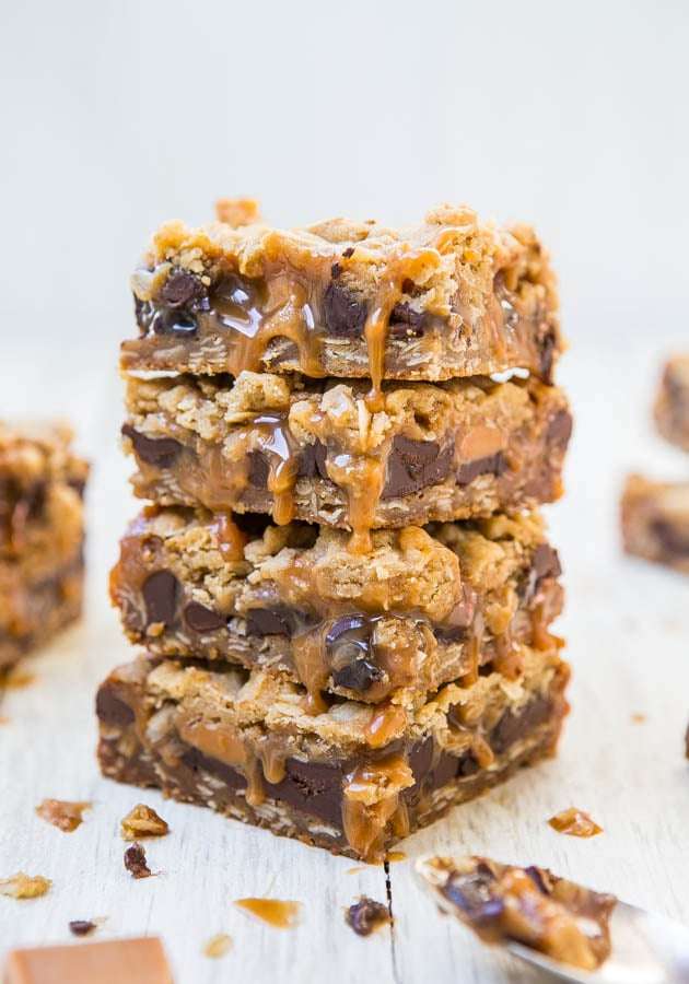 🎉🧡😋 For the serious caramel lover, these soft and chewy bars are dripping with caramel and stuffed with chocolate! Easy one-bowl, no-mixer recipe!