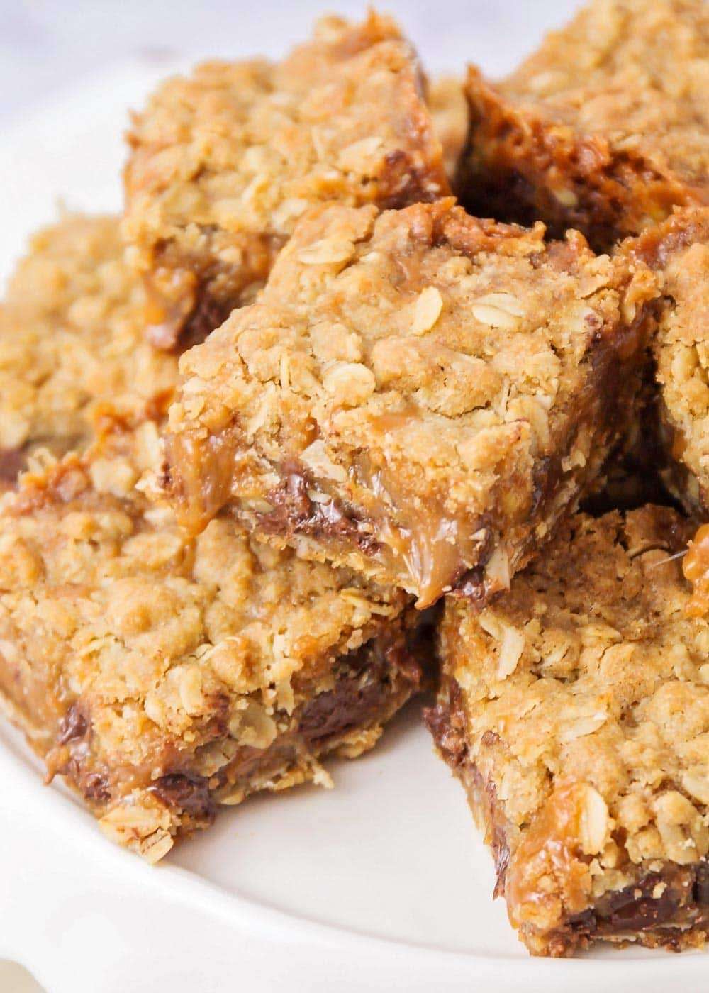 Gooey oatmeal carmelitas are loaded with chocolate and caramel flavor. These favorite dessert bars are perfect for sharing!