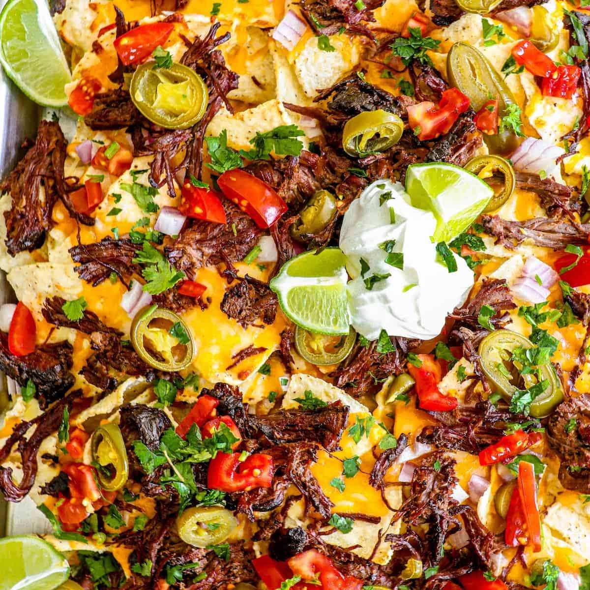 Carne asada beef nachos are a crowd-pleasing dish featuring crispy tortilla chips layered with juicy, marinated beef, melted cheese, and a variety of toppings, creating a perfect blend of textures and flavors in every bite.