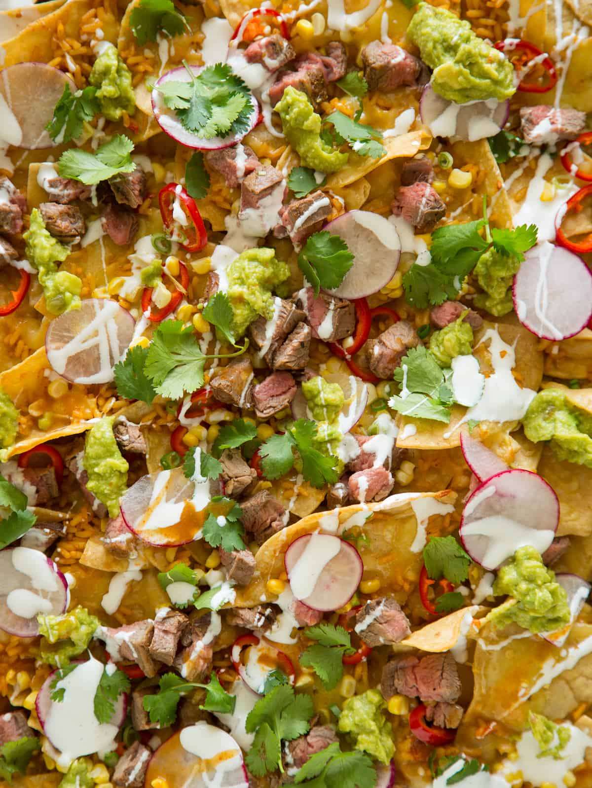 - To assemble: Spread tortilla chips onto a baking sheet in a single layer and top with half the shredded cheese. Top cheese with cubed carne asada. Sprinkle with remaining shredded cheese.