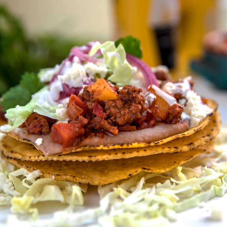 - Assemble by spreading some refried beans on each tostada shell and top with ground beef mixture. Add chopped cabbage, cheese, creama, pickled red onion and chopped cilantro.