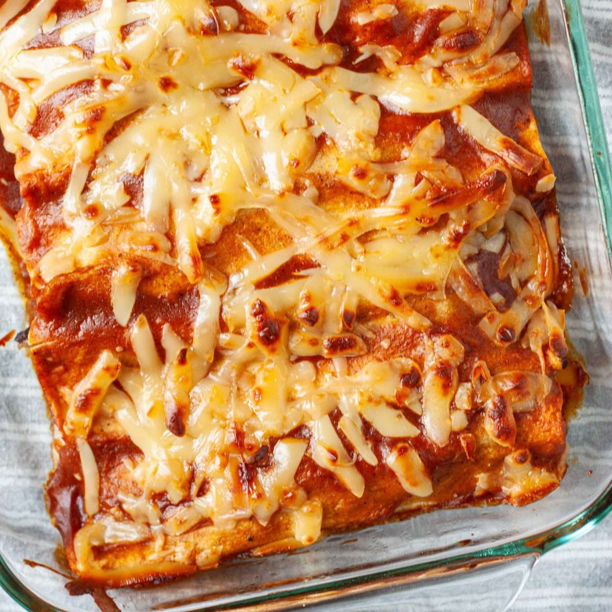 - Coat the bottom of an 11x7 baking dish with the enchilada sauce, around ½ cup or so of the sauce.