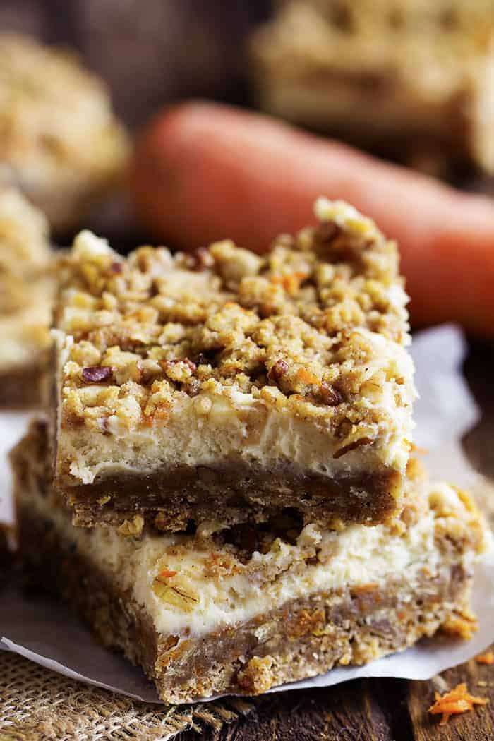 Crumbly spiced carrot cake bars with a delicious cheesecake center! They are packed with flavor and sure to be a hit!