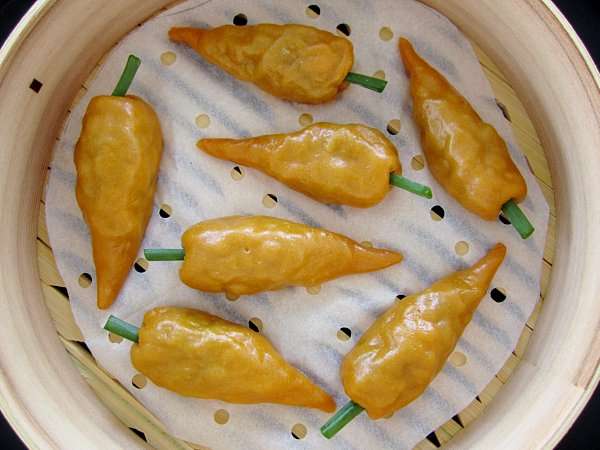 - Remove the steamer trays and cut a small hole into the top of each “carrot” using a paring knife. Stick a 1-inch piece of scallion into this hole to resemble a carrot top. Serve dumplings immediately while hot (they will actually start to stick to the parchment if they are allowed to cool on there too long).