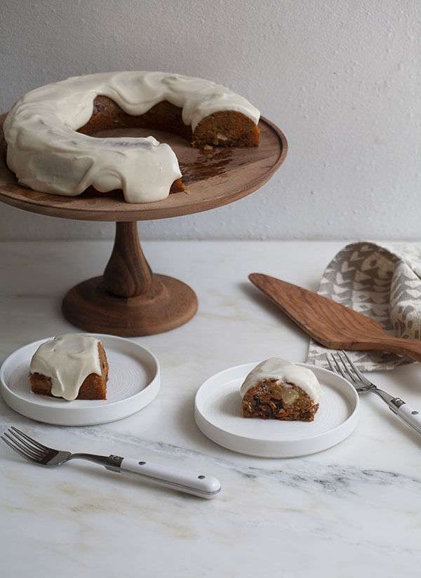 - Meanwhile, in a bowl of a stand-up mixer (or you could use a hand-mixer), add the butter, cream cheese, powdered sugar and a tablespoon of buttermilk. Beat until very smooth. Add 2 more tablespoons of buttermilk. The texture should be between a glaze and a frosting. If you like, you can add a bit more buttermilk to make it more pourable. I liked it like this! Pour the frosting glaze stuff onto the cake. Slice it up and serve at your convenience.