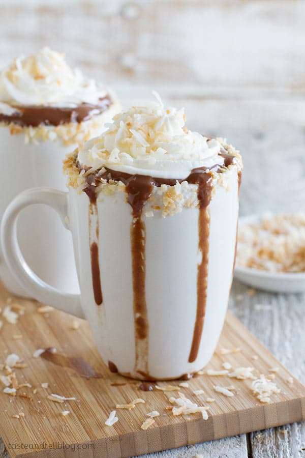 - In a medium bowl, beat the cream until soft peaks start to form. Gradually beat in the powdered sugar. Beat in the coconut extract, and continue to beat until stiff peaks form. Serve the whipped cream on top of the hot chocolate, garnished with toasted coconut.