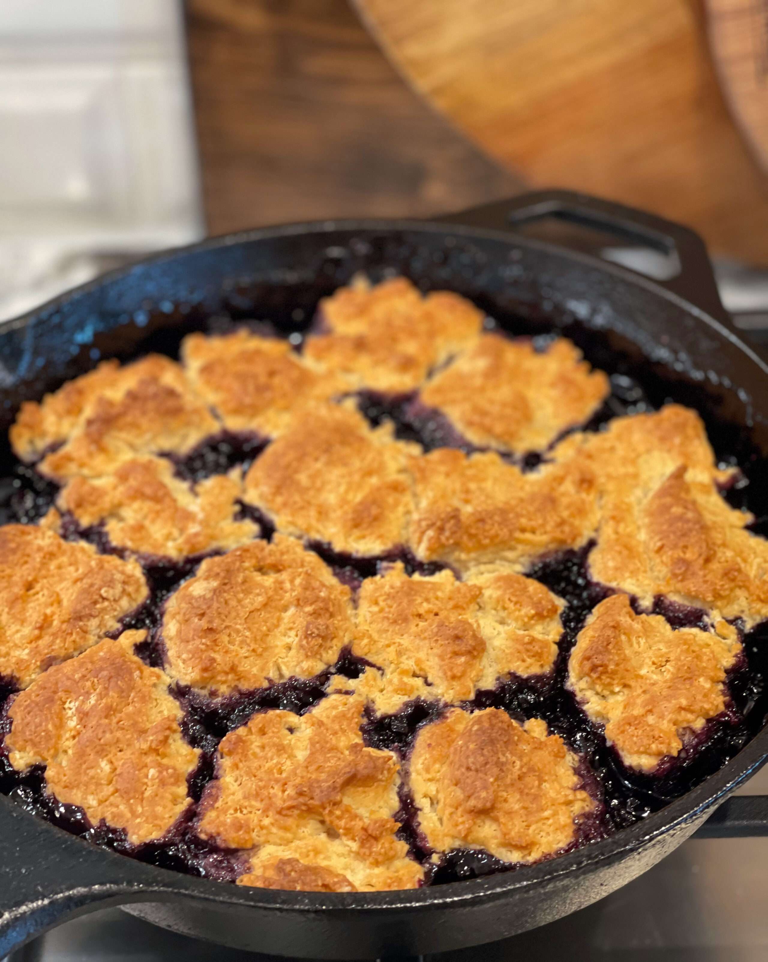 This Cast Iron Blueberry Cobbler comes together in no time and is packed with flavor! Serve with a scoop of ice-cream or on its own for a tasty sweet treat!