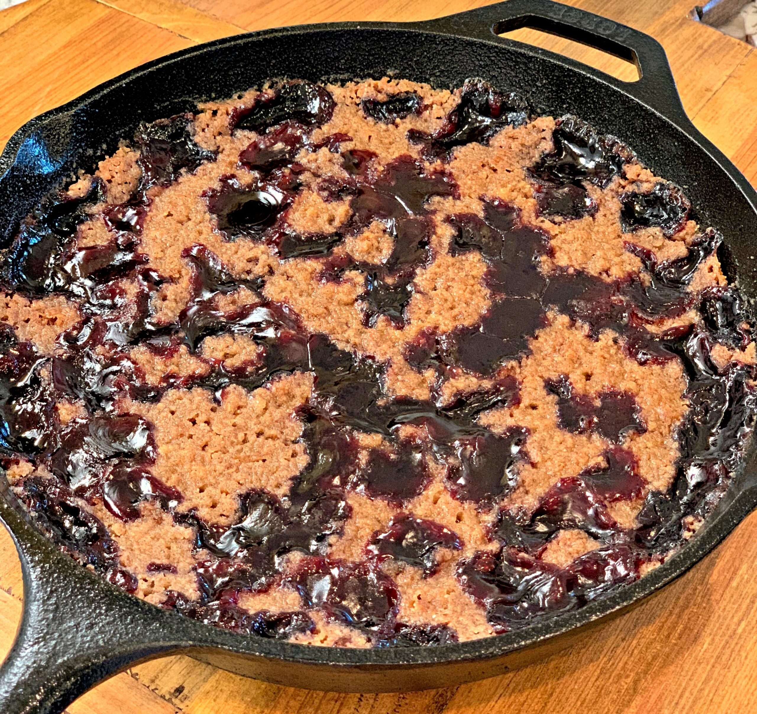 - Remove from heat and pour cherry mixture into a cast iron skillet or baking pan. *I used a 10.25 inch cast iron skillet, an 8x8 baking pan works too