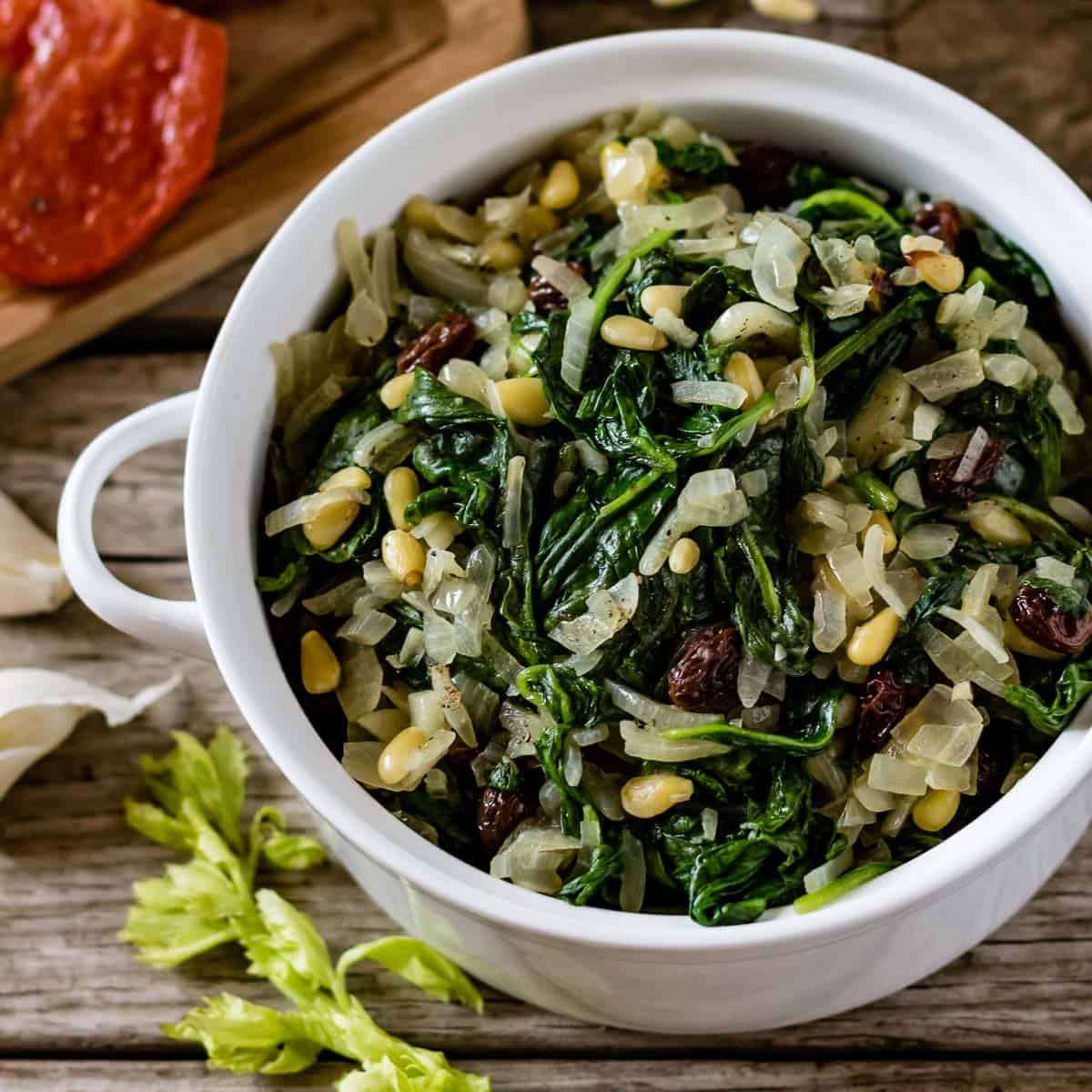 This Catalan Spinach is a fantastic Spanish Tapas dish that is quick and easy to make. Flavored with pine nuts and raisins, it is a flavor-packed dish that is guaranteed to impress.
