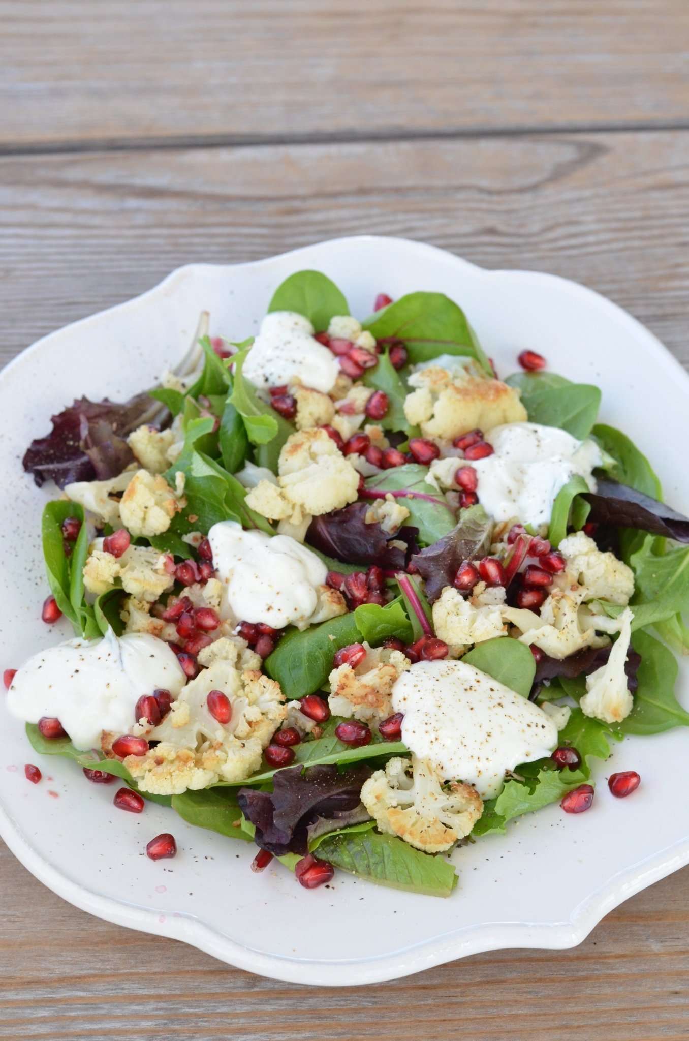 - Arrange a layer of lettuce on a large platter and then sprinkle the pomegranate seeds and cooked cauliflower on top. Finish with dollops of dressing and salt and pepper.