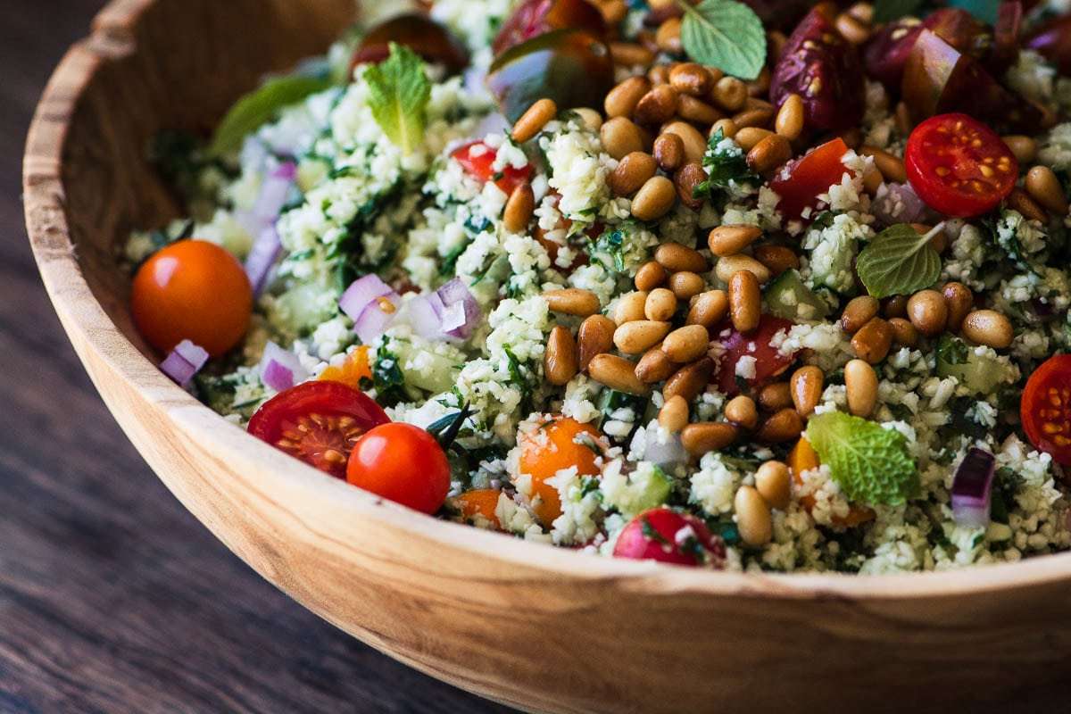 - Add the tomatoes, cucumber, onion, and fresh herbs to the cauliflower and toss to combine.