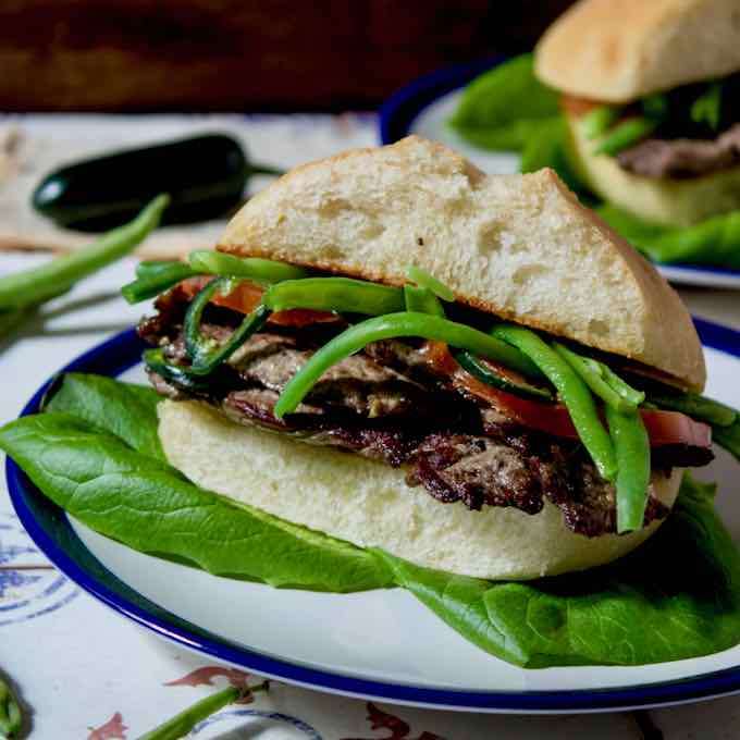Chacarero is a traditional Chilean sandwich made from finely sliced beef sirloin. It is made with marraqueta bread, tomatoes and green beans.