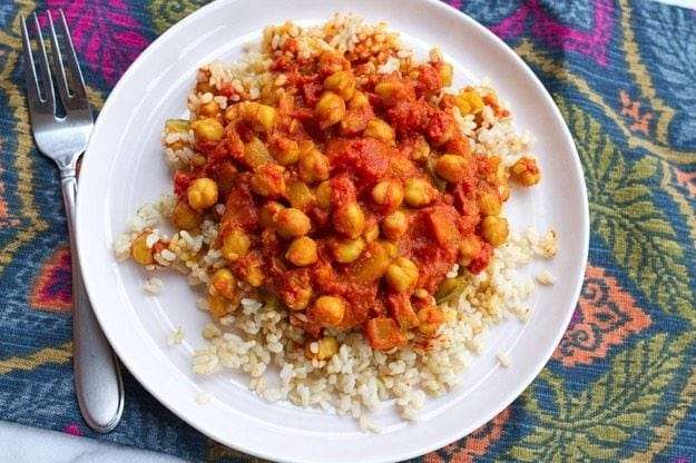 This chickpea channa masala is a healthier version of the classic Indian dish. Serve with brown rice and vegetables for a flavorful meal that's packed with plant-based protein. Vegan.