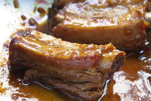 - After the ribs are fully cooked and tender, remove the lid and return the pot to the oven, letting it cook until the sauce is reduced to your liking. (Turn the ribs once or twice while the sauce is reducing.) It should take less than 25 minutes for the sauce to thicken.