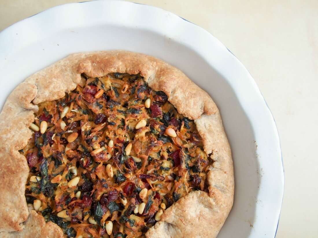 - Remove the vegetables from the heat once soft then add raisins, pine nuts and parmesan and mix through well. Pour the mixture into the middle of the pastry, flatten out slightly and fold over the pastry edges so that it holds the filling in.