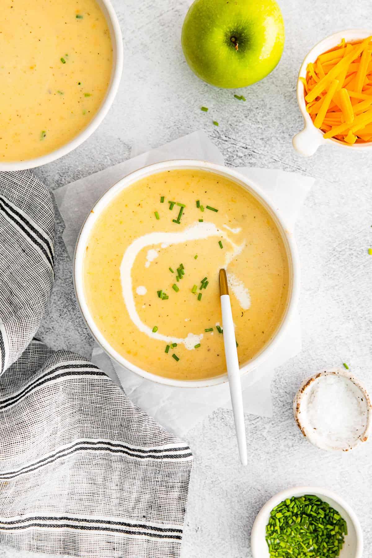 This cheddar apple soup uses granny smith apples and golden potatoes, along with aromatic vegetables and savory cheddar cheese, to make the most comforting fall soup.