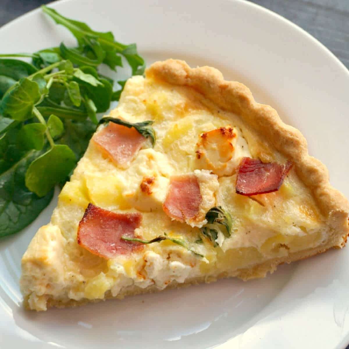 Cheese, Ham and Potato Quiche with a homemade buttery crust, and delicious hearty filling, a fantastic brunch recipe for Spring. The rocket salad/arugula adds a nice touch of colour and freshness, making this potato quiche a lovely choice for your Easter menu. Easy to make, a big win with the whole family.