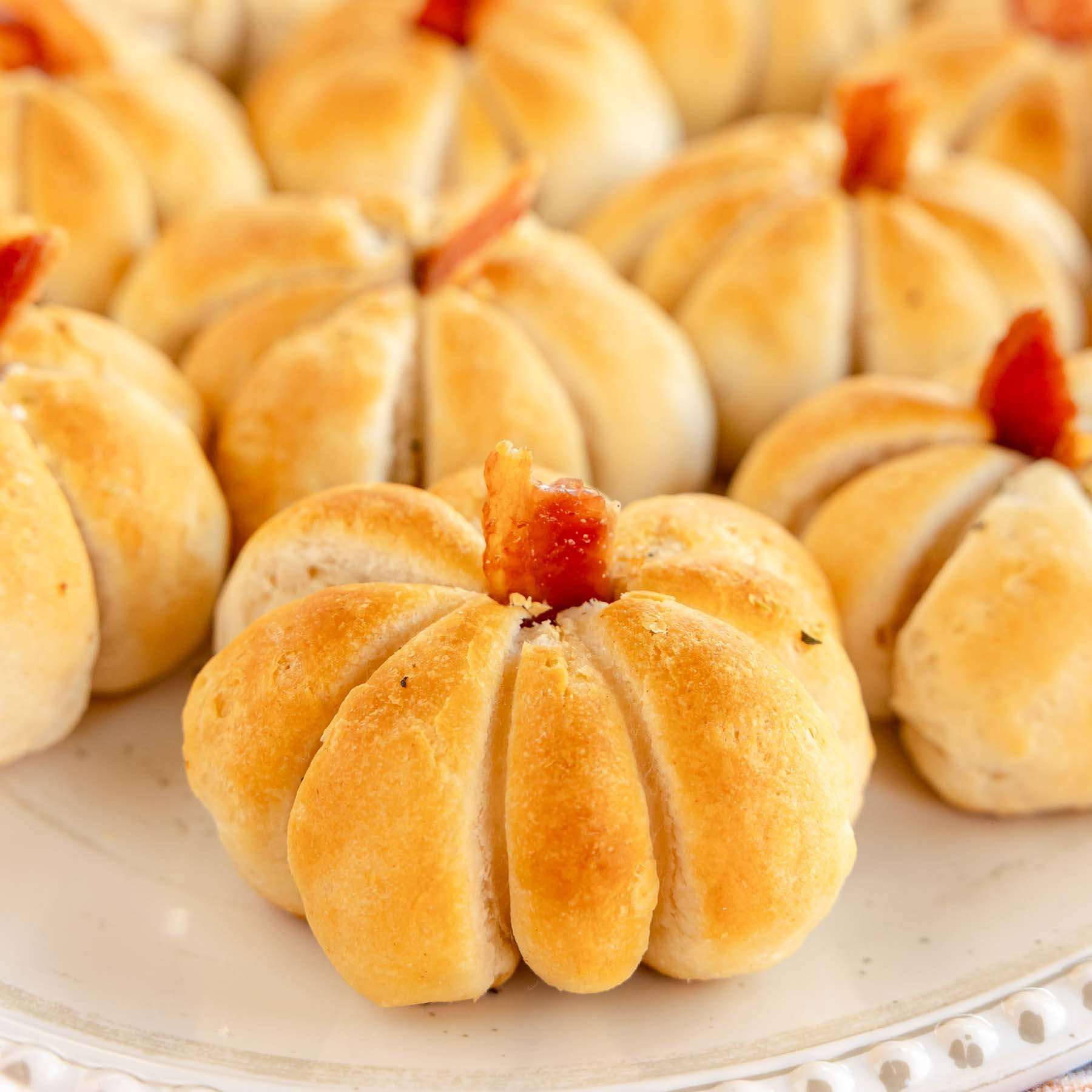 This festive pumpkin shaped rolls are stuffed with bacon and cheddar cheese to make for one of the most delicious fall appetizers