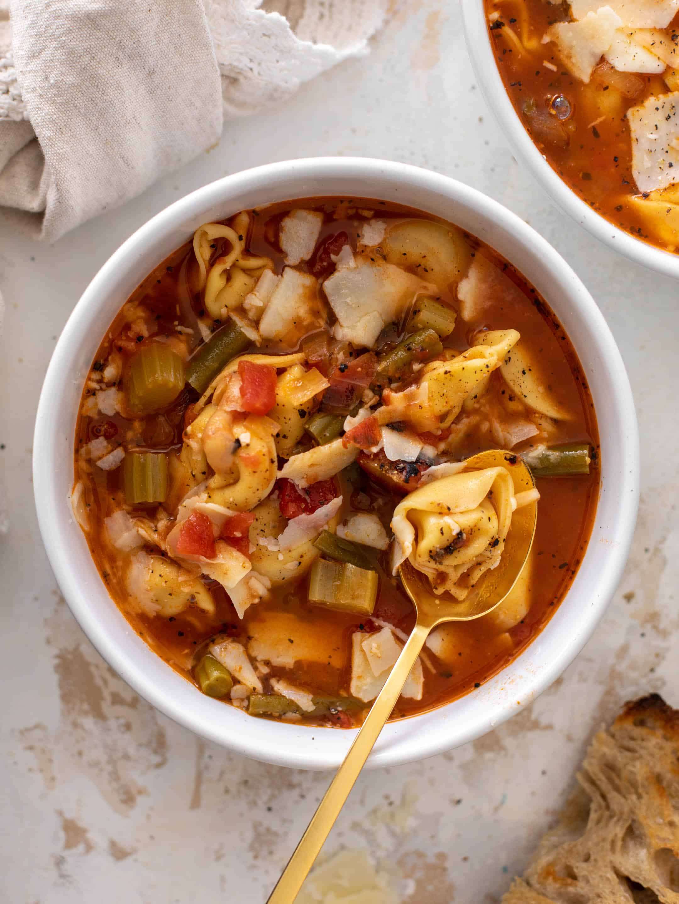 This cheese tortellini is a fun, satisfying spin on the traditional soup. Lots of vegetables, creamy white beans, fire roasted tomatoes and tortellini come together in a bowl covered in shaved parmesan. It's comforting and hearty!