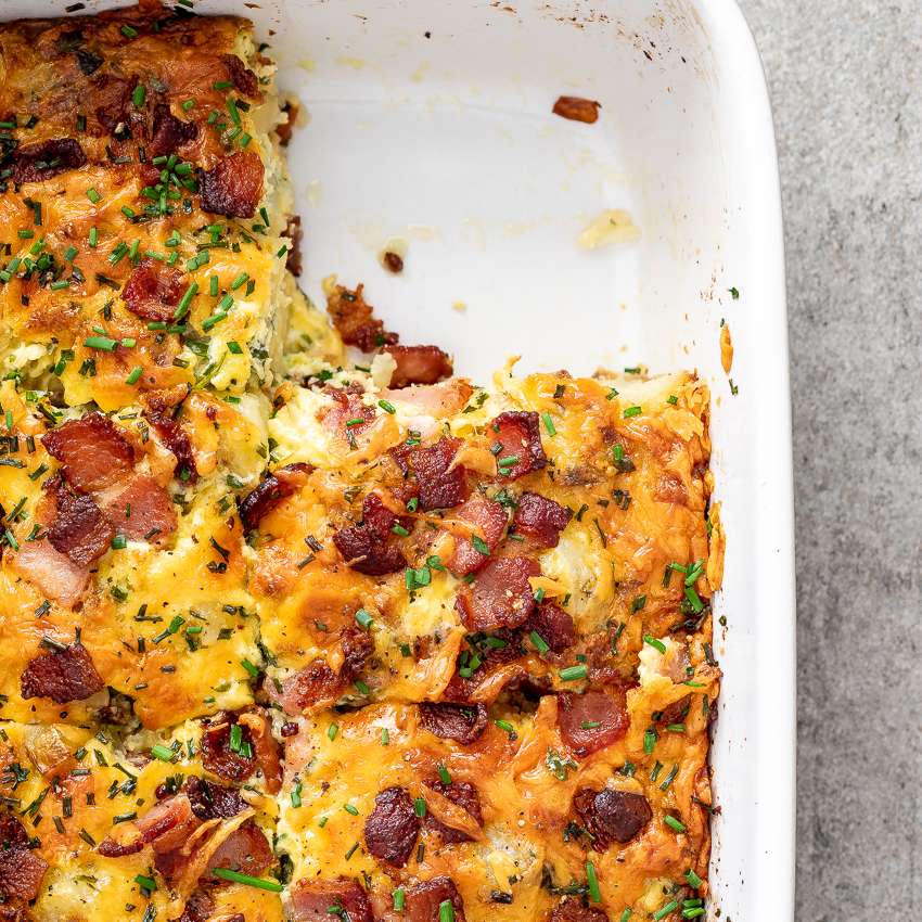 This cheesy breakfast casserole with bacon, potato and egg is the easiest make-ahead breakfast and so perfect for feeding a crowd.