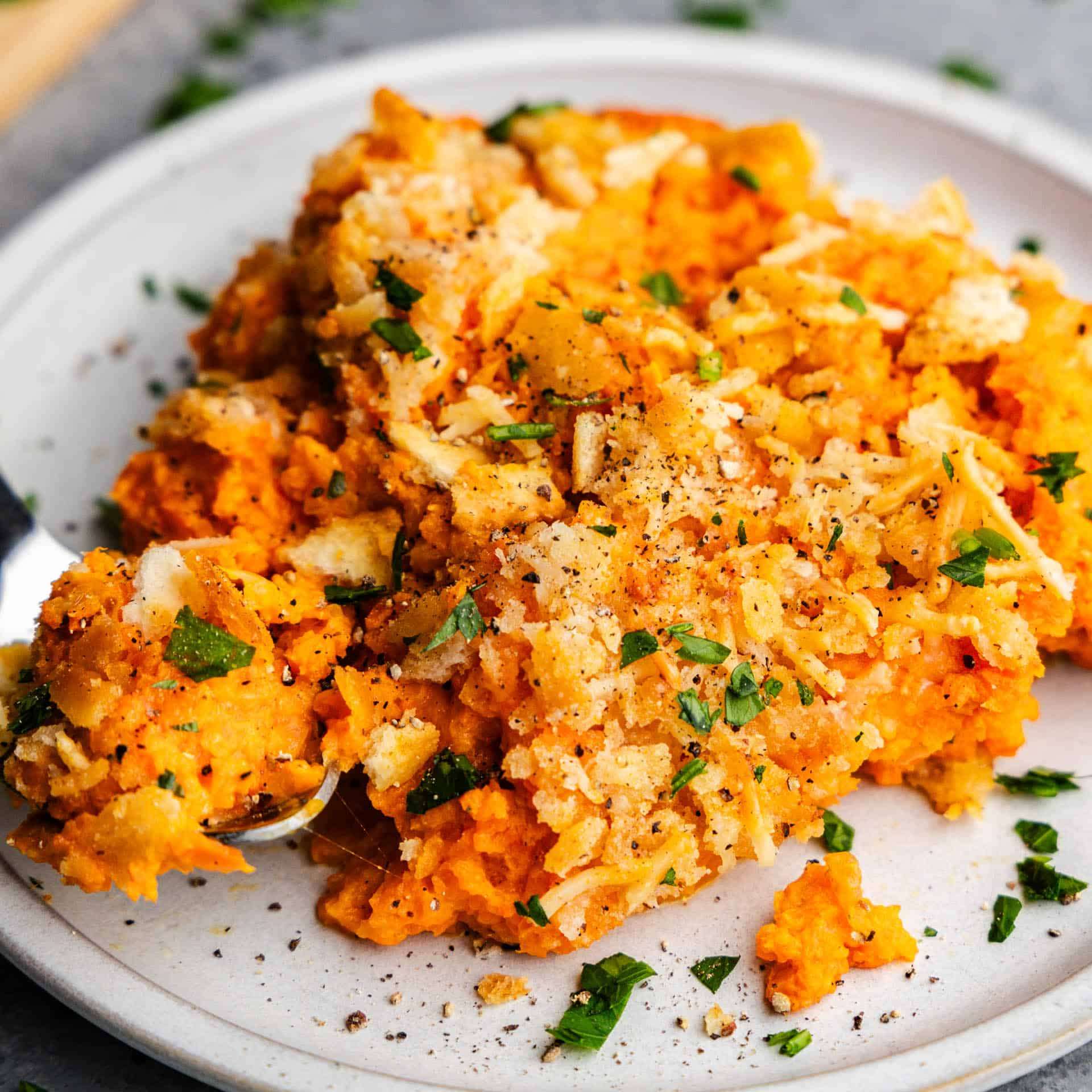 Cheesy carrot casserole is always the surprise star of the show with its creamy mashed carrots topped with a buttery Ritz cracker topping.