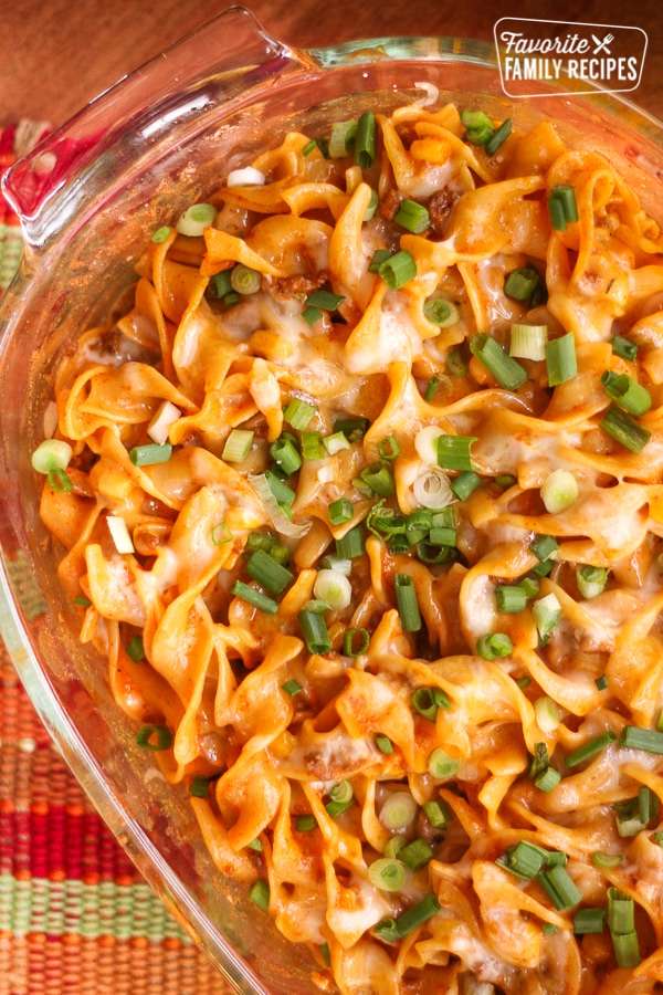 - While noodles are cooking, brown your ground beef in a large skillet and drain the fat. Add chili powder, cumin, and cayenne pepper to beef mixture.