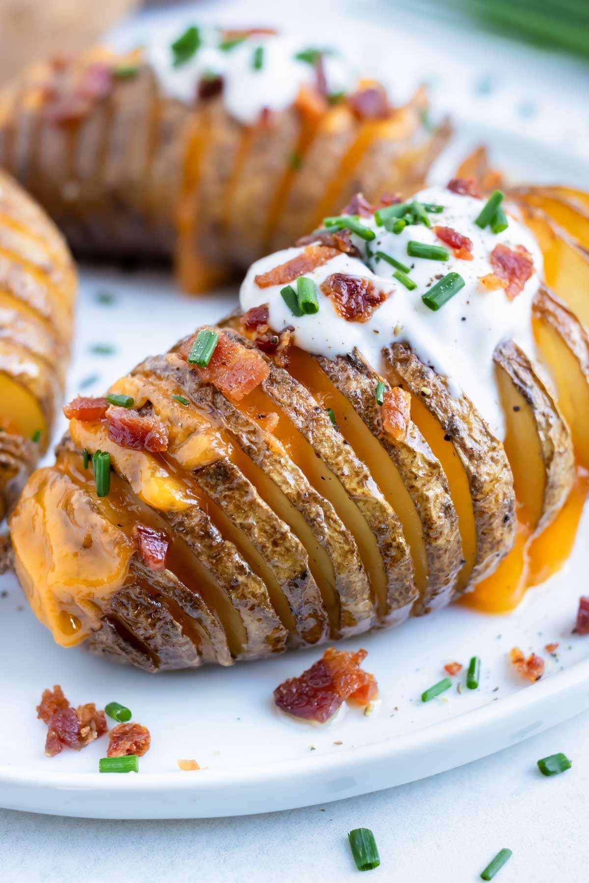 - Serve hasselback potatoes with crumbled bacon, sour cream, and green onions. Enjoy!