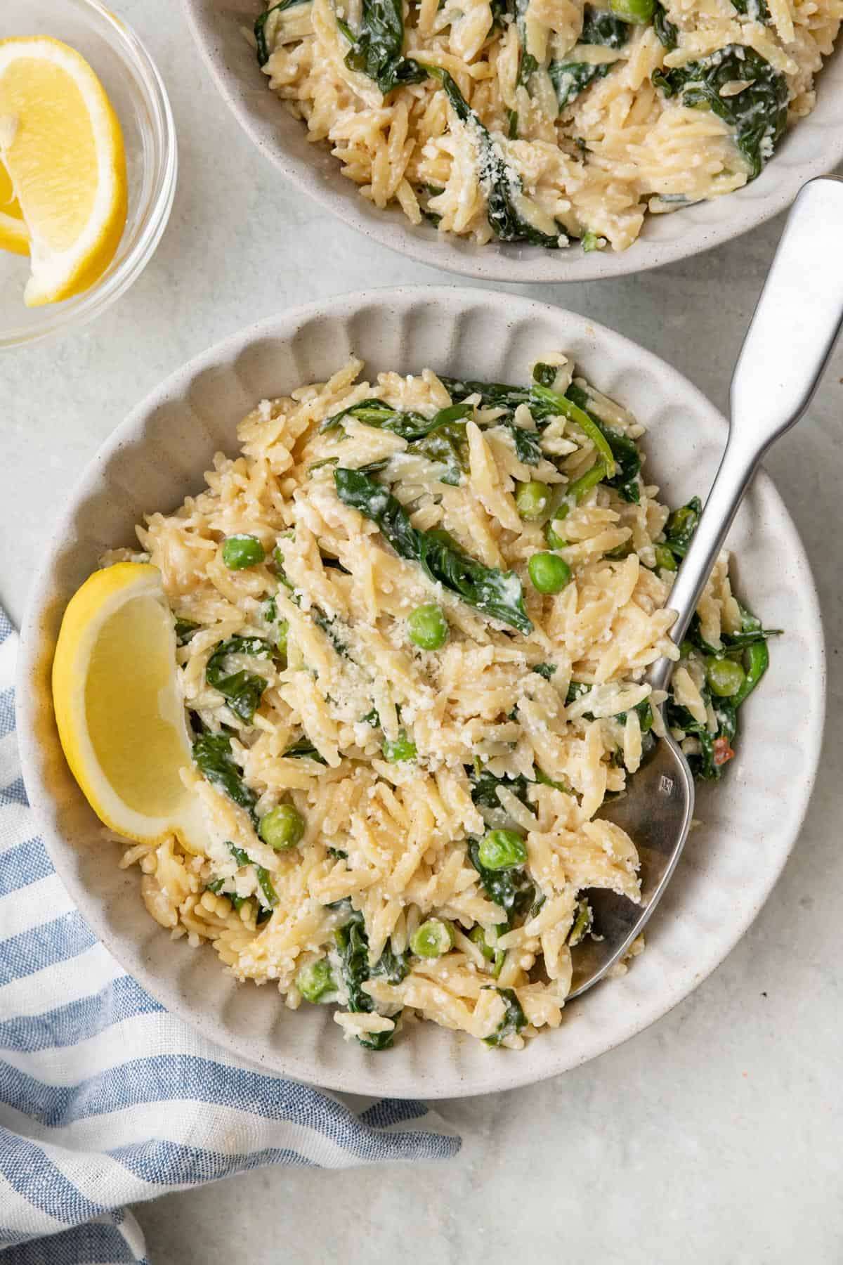 Get ready for a burst of flavor with our Cheesy Lemon Orzo! With fresh peas and spinach, this dish is a zesty and satisfying meal in a bowl or served as a side dish.