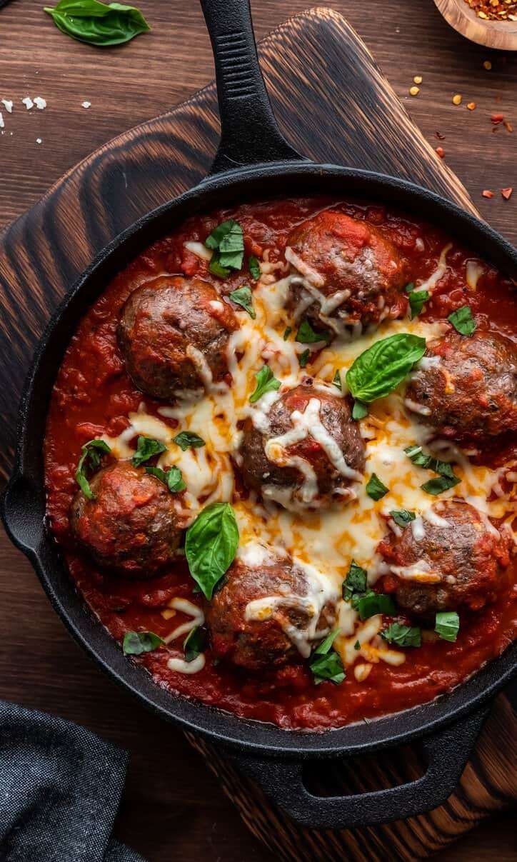 - Preheat the oven to 400. Sprinkle the mozerella and paremesean over the top of the meatballs and sauce and bake until heated through and cheese is melted and bubbly – about 15 minutes. Garnish with fresh basil. Serve warm.