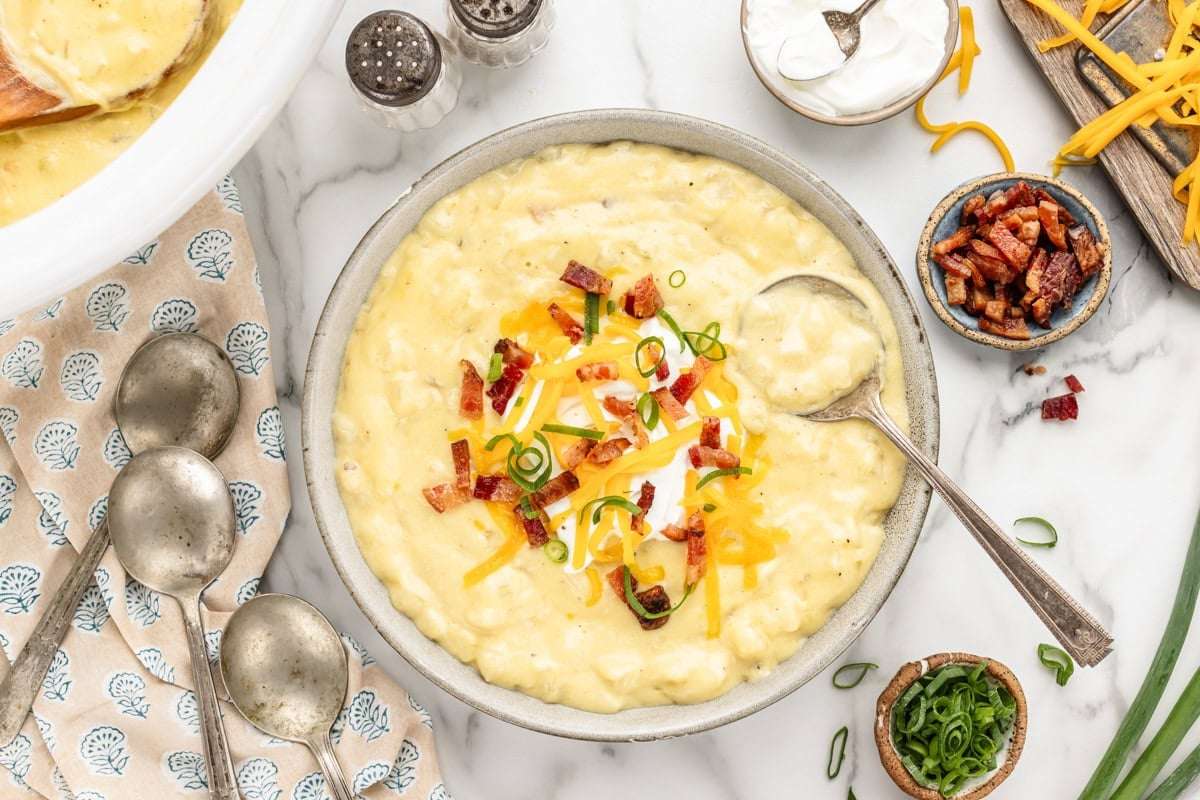 Creamy cheesy potato soup is made with a handful of ingredients for a simple set-it-and-forget-it crockpot classic!