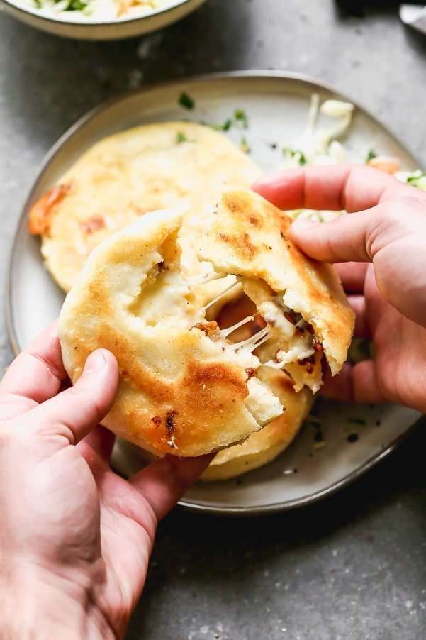 - Serve the pupusas with a little bit of slaw and eat right away while gooey and hot.