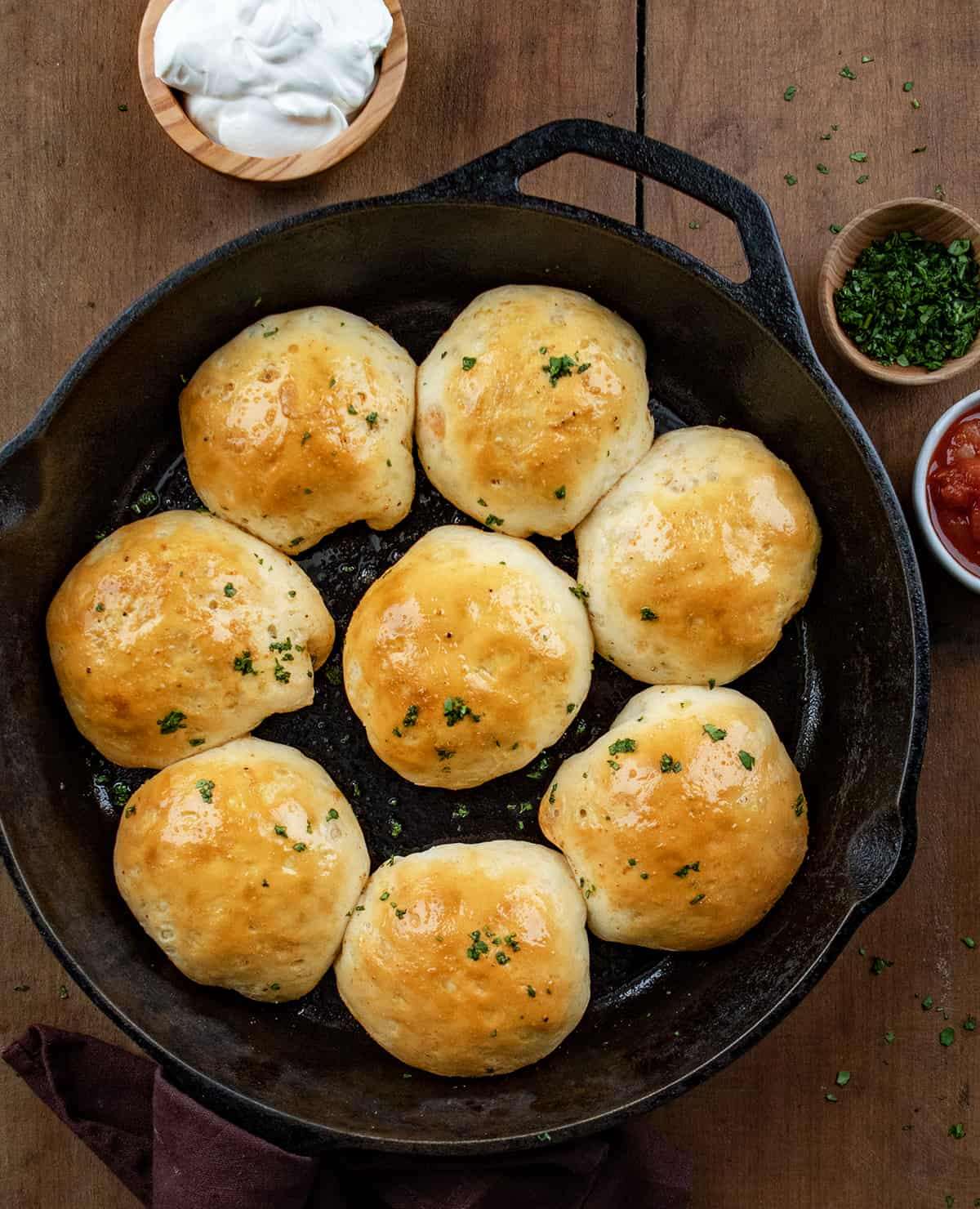- Place the sealed biscuits, seam-side down, into the prepared skillet.