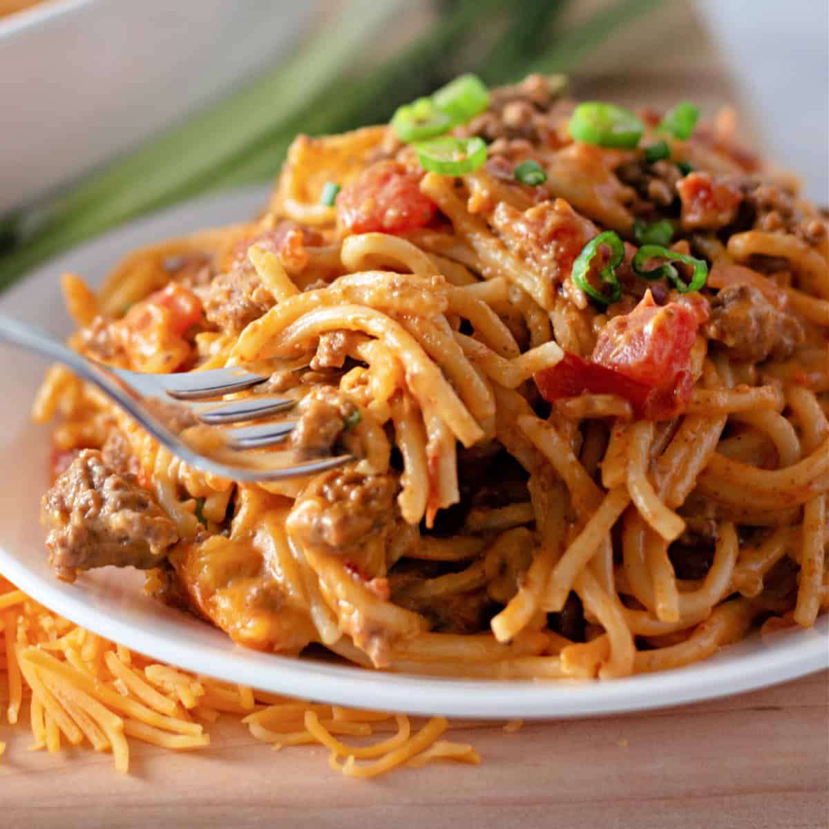 For the perfect twist on Taco Tuesday or spaghetti night, make Cheesy Taco Spaghetti! Seasoned ground beef and pasta mixed with a cheesy sauce and baked until hot and bubbly—a satisfying and easy dinner the whole family will enjoy.